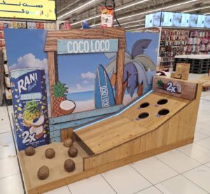 Back2School promotional podium, a creative and eye-catching structure that showcased Rani Coco Loco products prominently in the retail environment, and an interactive activation designed around tossing coconuts into a target board. Execution Steps Booth Design Production of Booths Sampling Execution